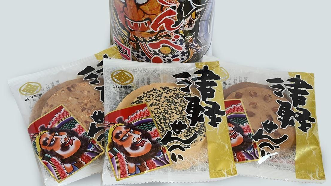 透明で中が見えるケース入。津軽せんべい定番のピーナッツ・ごま・まめ煎餅の三色セット。(16枚入り)