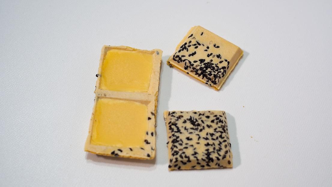 香ばしく焼き上げたごませんべいにチーズをのせ、一ロサイズで、おつまみに最高です。